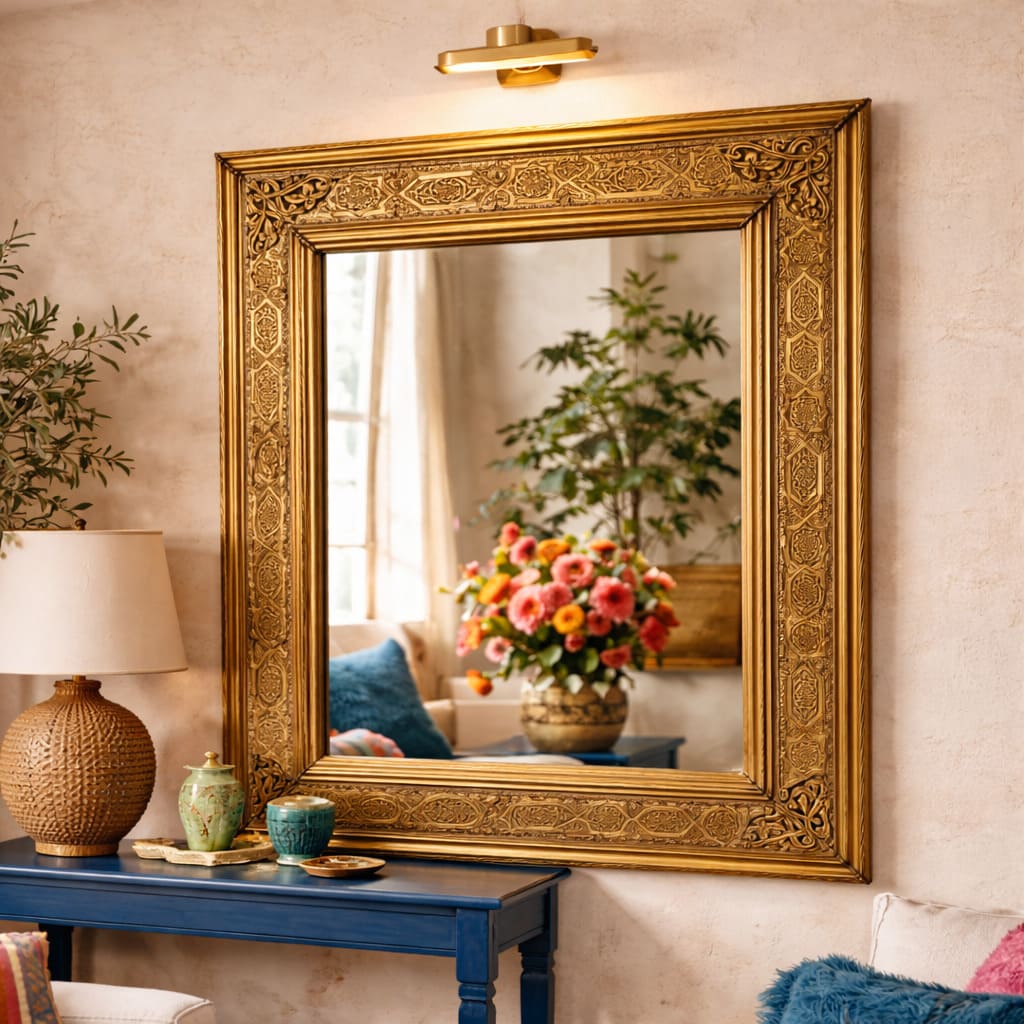 Fabriqué artisanalement, ce miroir doré inspire l'élégance, la modernité et une remarquable touche andalouse.
