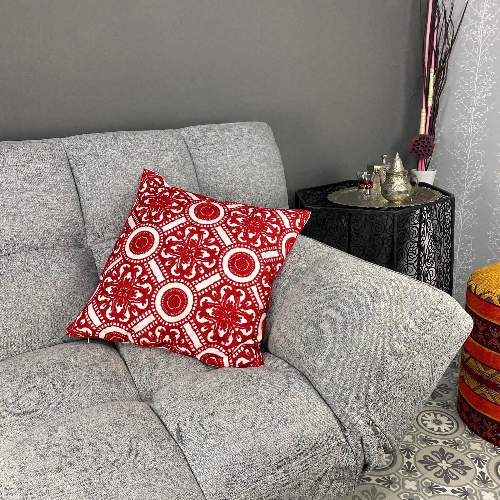 Housse de coussin rouge à motif floral de style arabe, modèle MK6. Ces housses de coussin pour pouf sont uniques et disponibles en quantité très limitée. Apportez une touche arabe authentique à votre salon, votre séjour ou votre chambre grâce à l'élégance exclusive de ces coussins arabes modernes.