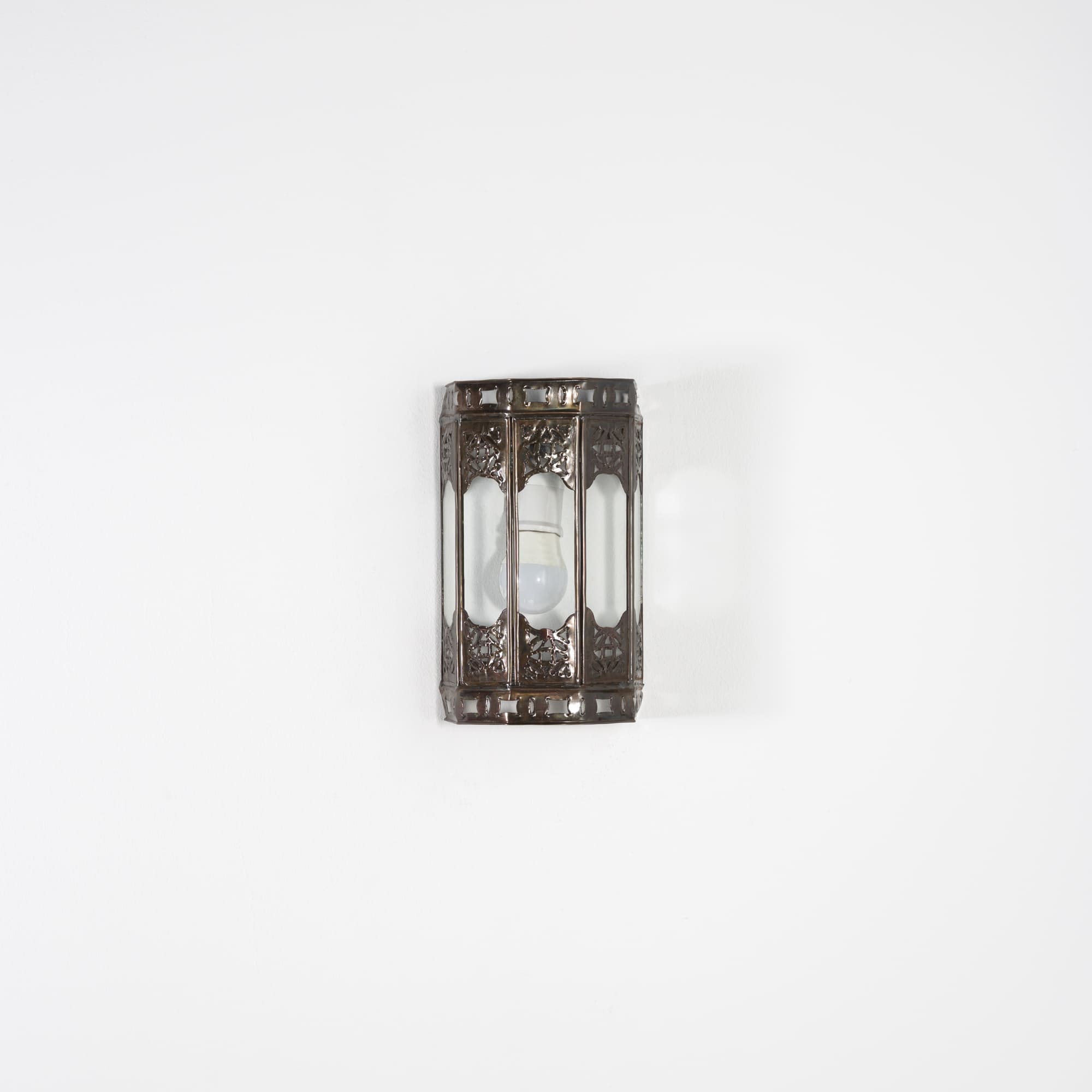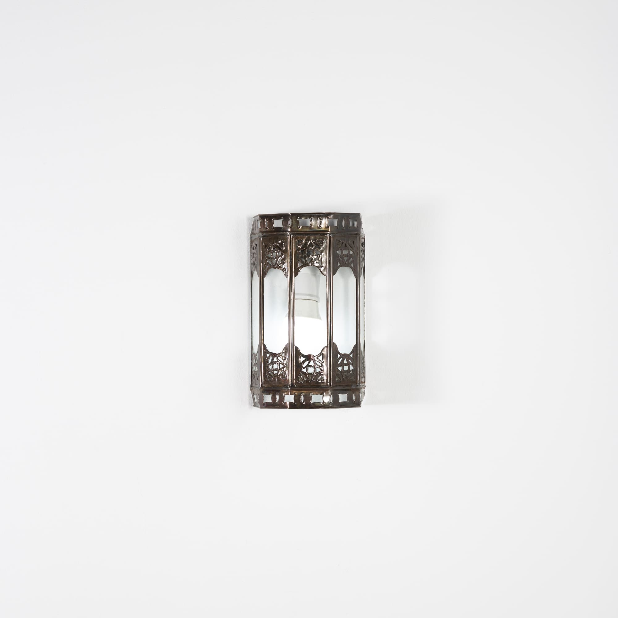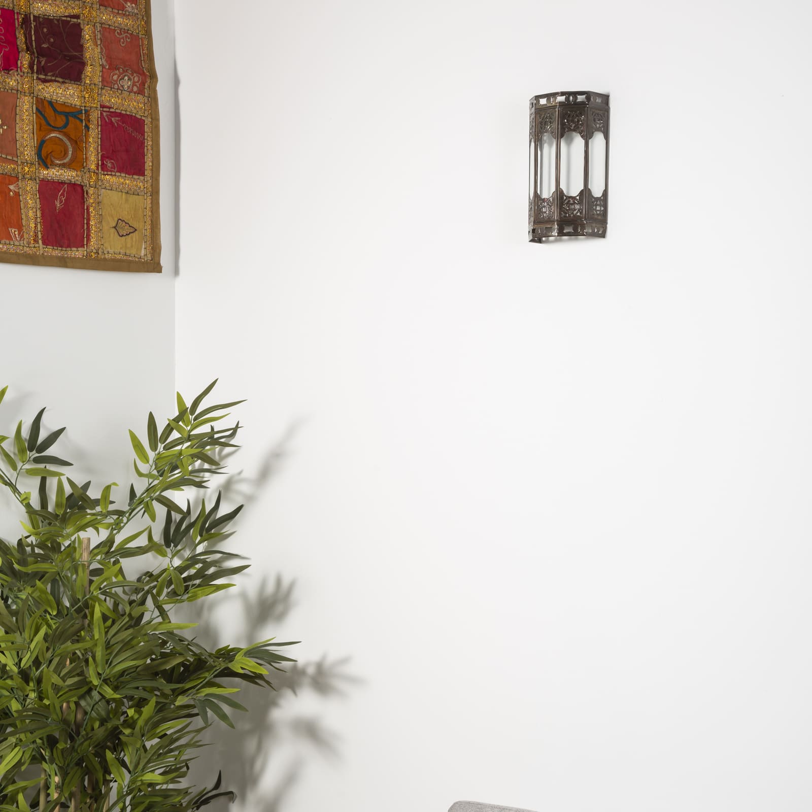 Applique murale artisanale de style arabe, en verre blanc transparent et argent alpaga ajouré. Ouverte en haut et en bas, elle laisse passer une lumière abondante. Cette applique est idéale pour éclairer les couloirs, les chambres, les salles de bain, les terrasses et autres espaces extérieurs, offrant un excellent éclairage.