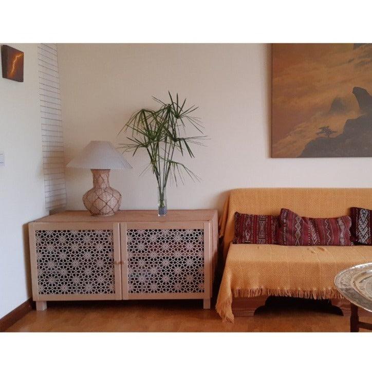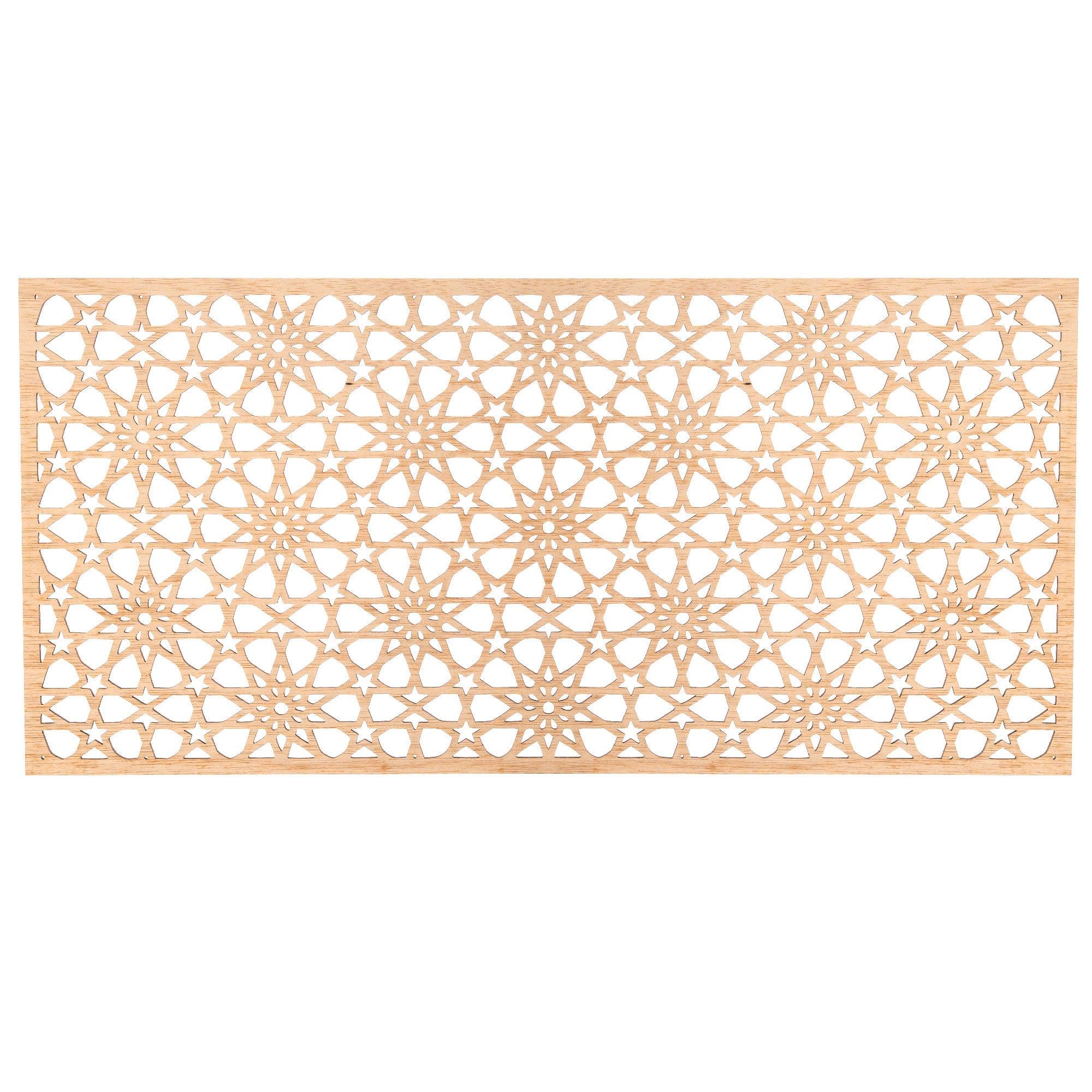 Treillis en bois d'inspiration mauresque, nouveau modèle Mekness. Fabriqué en bois lamellé-collé avec une finition soignée. Disponible en plusieurs coloris, d'une épaisseur de 4 mm, il peut servir de tête de lit, de tableau décoratif, voire même à séparer des espaces de styles différents.