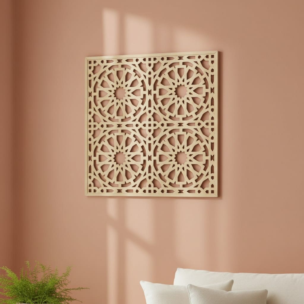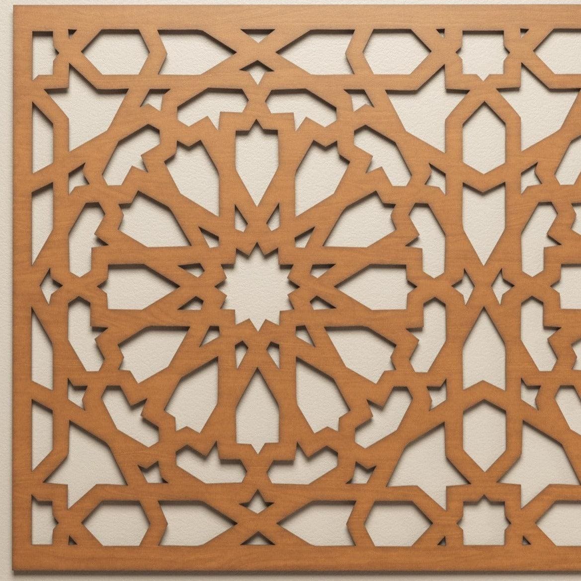 Treillis arabe en forme de cadre en bois aux motifs géométriques inspirés de l'Alhambra de Grenade, pour une décoration de style andalou.