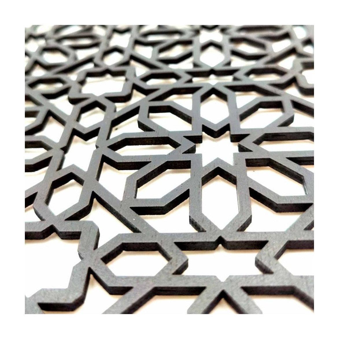 Treillis arabe découpé au laser dans du bois stratifié. Motif d'étoile andalouse couleur wengé, idéal pour décorer vos chambres, salons, espaces communs et tout type de pièce, comme un bureau moderne.