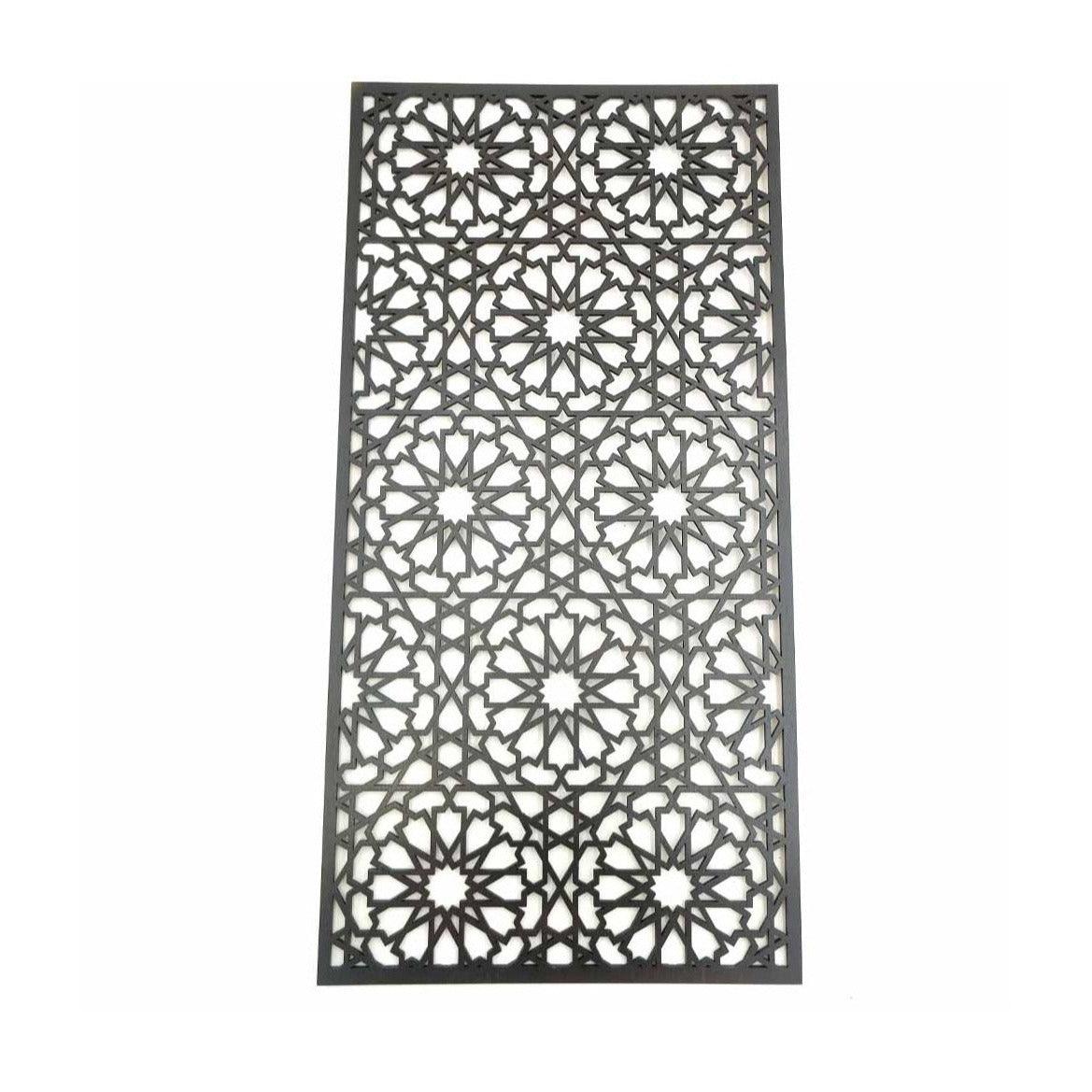 Treillis arabe en bois découpé au laser, couleur wengé. Inspiré du style andalou classique, prédominant à l'Alhambra de Grenade, il est idéal pour habiller vos murs. Disponible en différentes dimensions, il peut également servir de tête de lit ou de grand cadre décoratif pour habiller les murs de votre salon de la magie d'Al-Andalus.