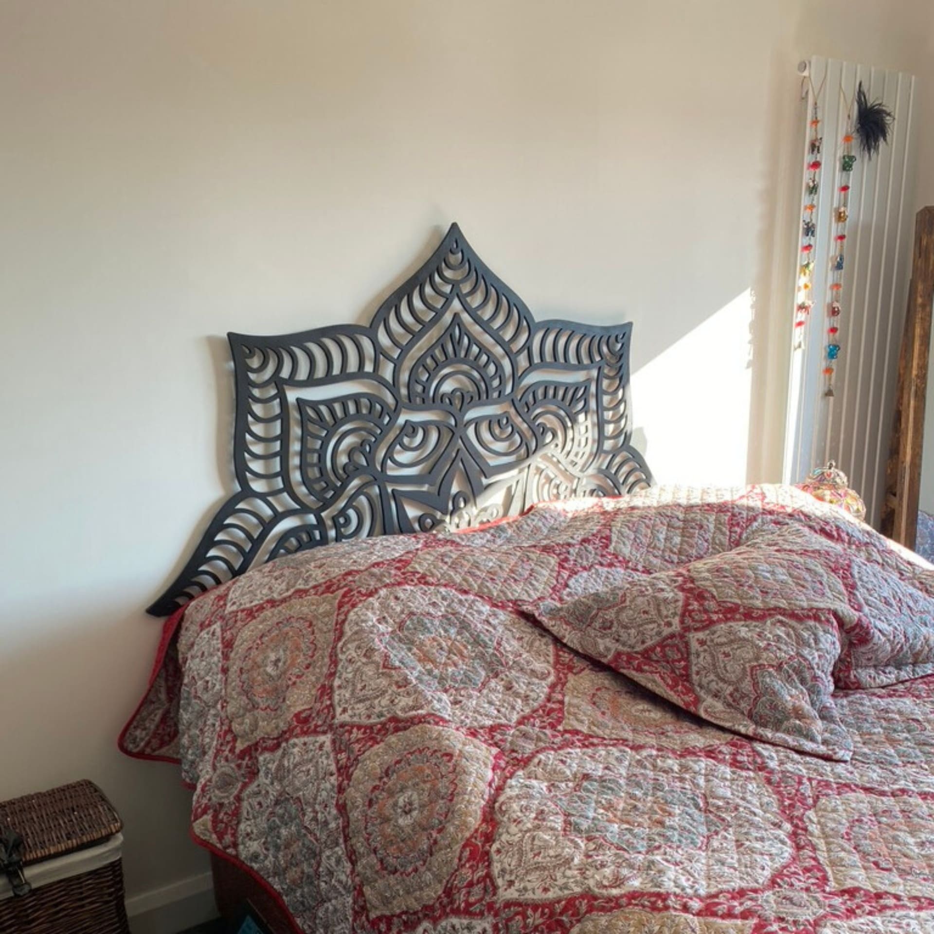 Tête de lit de 160 cm en treillis de bois. Idéale pour créer une ambiance orientale, moderne et apaisante. Design Warda, motifs floraux orientaux. En bois stratifié, fixations murales incluses.