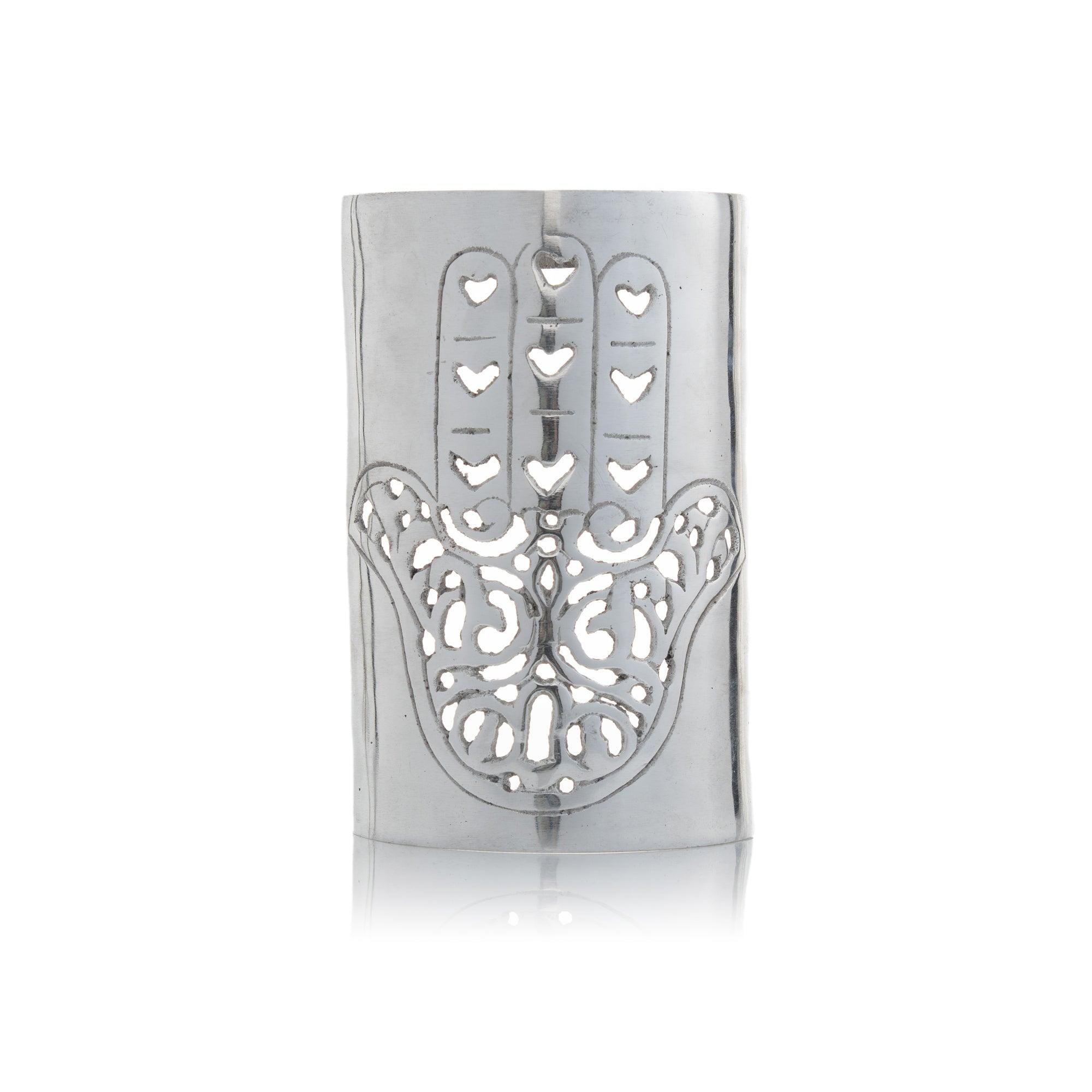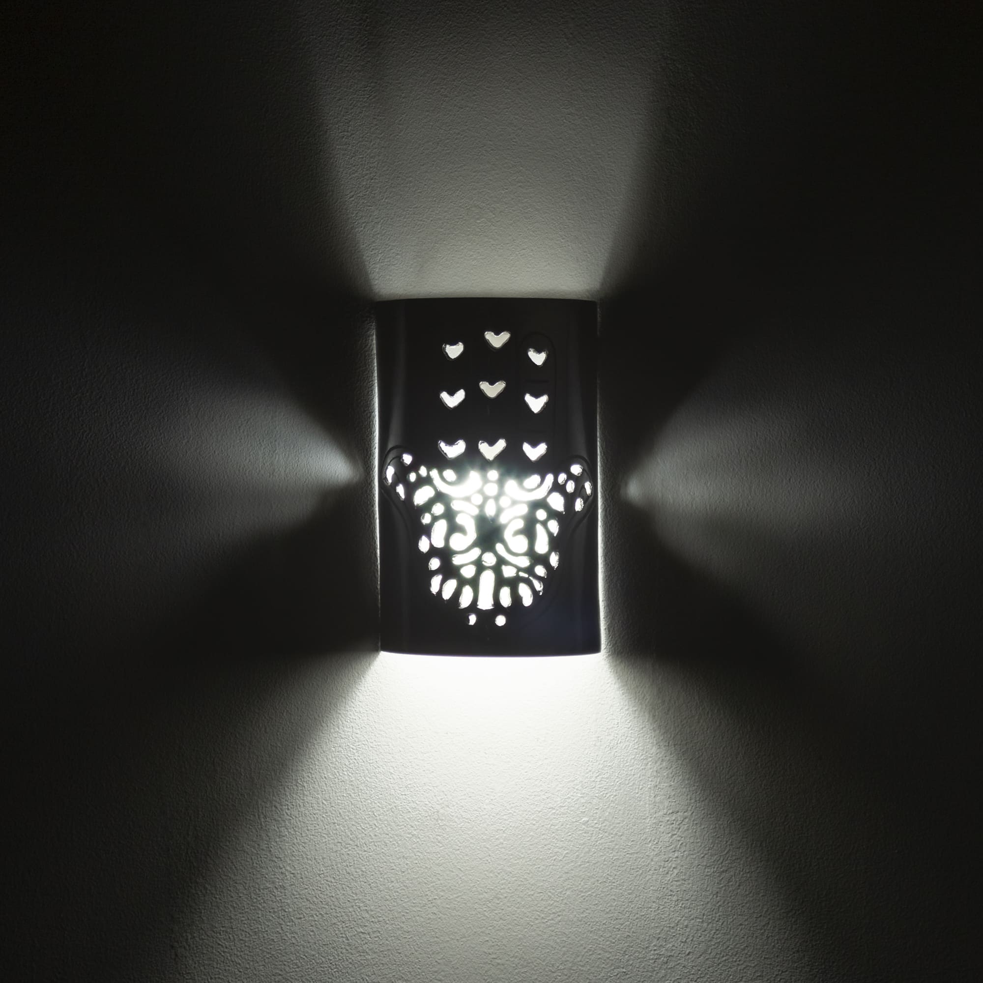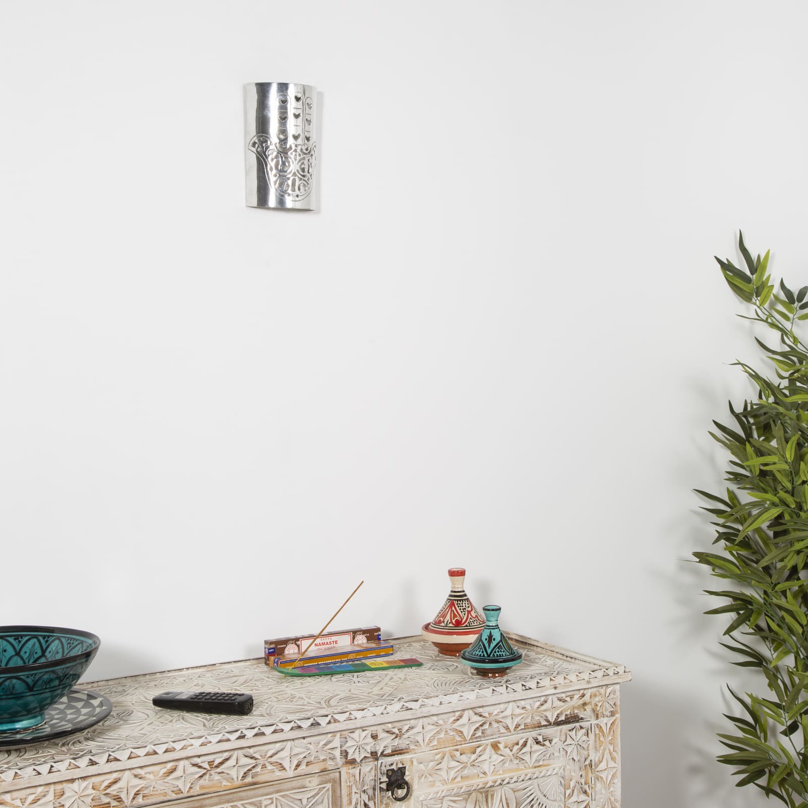 Applique murale en aluminium de style arabe ornée de la Main de Fatima, symbole mystique de protection contre les ténèbres et les énergies négatives. Cette applique murale arabe apporte protection et lumière à votre intérieur. Installation électrique non incluse.
