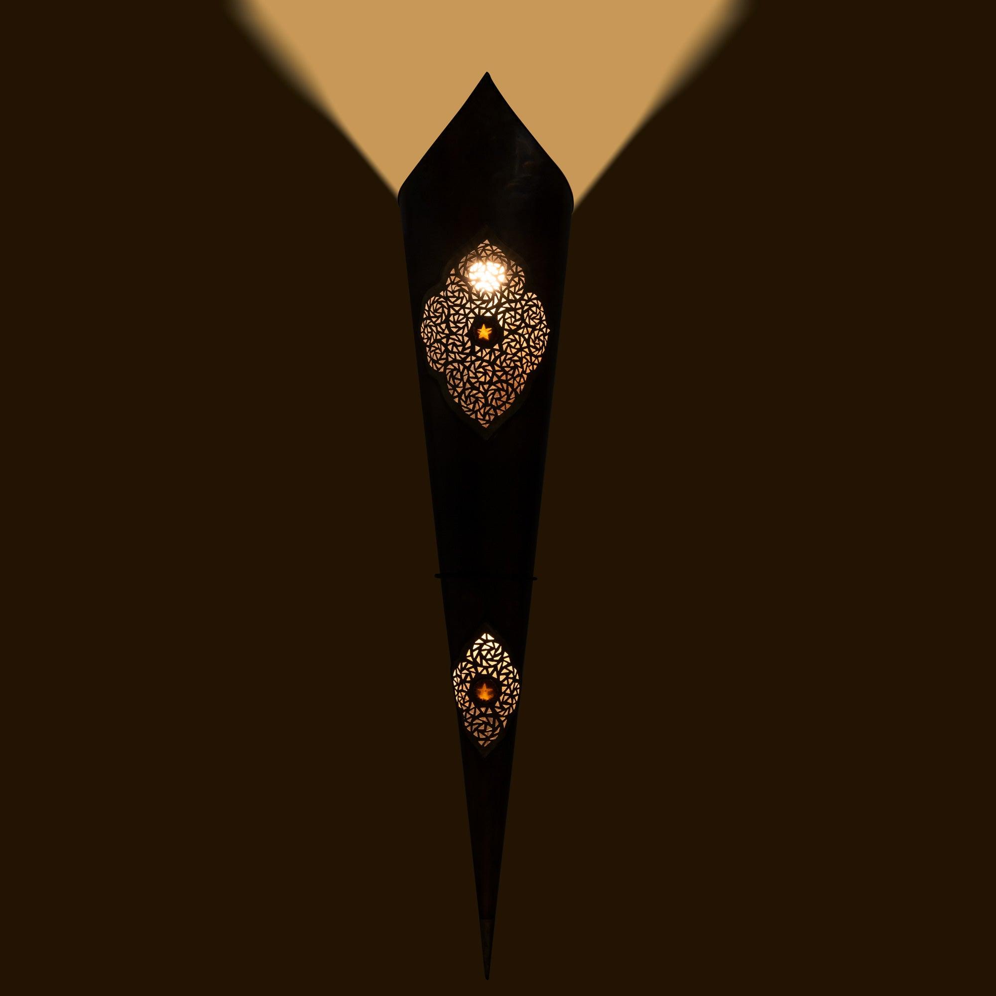 Torche arabe en cuivre et laiton ajouré, grande applique murale de style mauresque. Idéale pour les couloirs et les murs hauts grâce à sa hauteur. Cette torche marocaine crée de magnifiques jeux de lumière et apporte une touche orientale avec sa finition cuivrée. Elle crée une ambiance « vintage ». Elle peut être placée à l'extérieur, sur des terrasses ou des patios par exemple, mais couvert, La partie supérieure de l'applique murale est ouverte. Deux petites pierres sont incrustées dans le laiton.